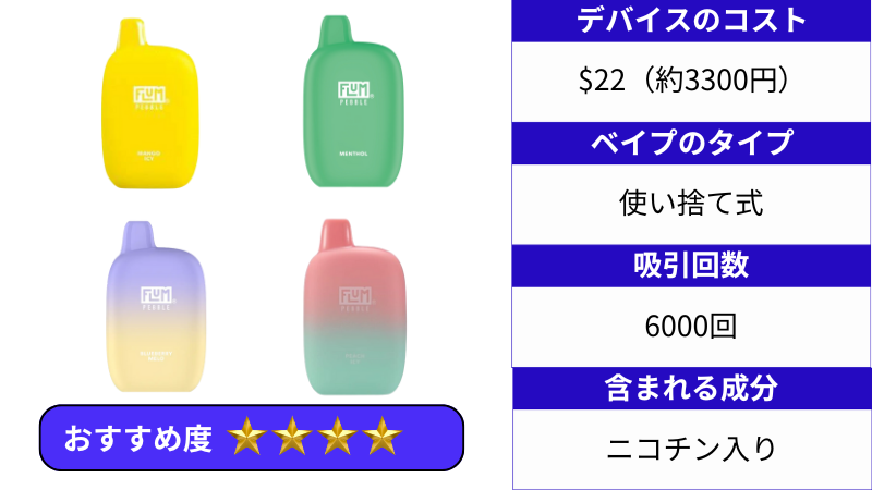 FLUM PEBBLE 6000 は使い捨て式であり、本体価格は日本円で約3300円です。6000回吸引が可能です。
