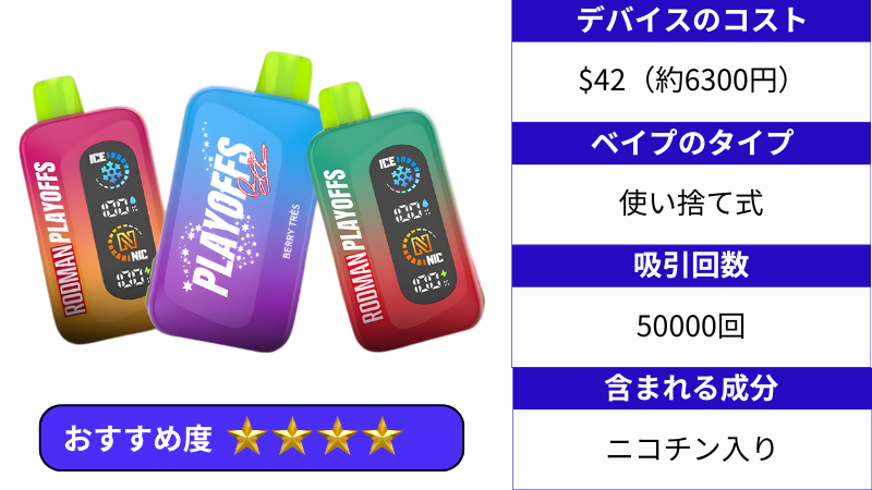 RODMAN PLAYOFFS は使い捨て式で、本体価格は日本円で約6,300円前後。最大 50,000 パフという圧倒的ロングライフ性能を持ったハイエンドモデルです。