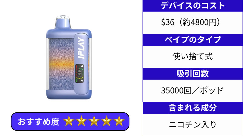iPLAY STAR 35K は使い捨てタイプのデバイスで、本体価格は日本円でおおよそ4,800円前後。最大で 35,000 回吸引できる超ロングライフモデルとして注目されています。